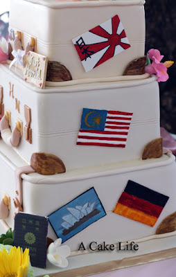 We were asked to create a “luggage cake” for a Japanese couple getting married at the Hau Tree Lanai at the New Otani Kaimana Beach Hotel. To honor their love of travel and the 11 countries they’ve visited, the 3-tier white fondant cake was made to look like three suitcases stacked on top of each other, with different clasps and handles on each. We handmade various sugar figurines to represent the different places they’ve visited: postcards of the Sydney Opera House for Australia and a bull fighter for Spain, flags from various countries (Germany, Malaysia, etc.) hibiscus, orchids and plumeria flowers for Hawaii and two Japanese passports. The cake topper was provided by the bride and groom and for their flavors, they chose our Yellow Butter Cake with Strawberry Cream Filling.